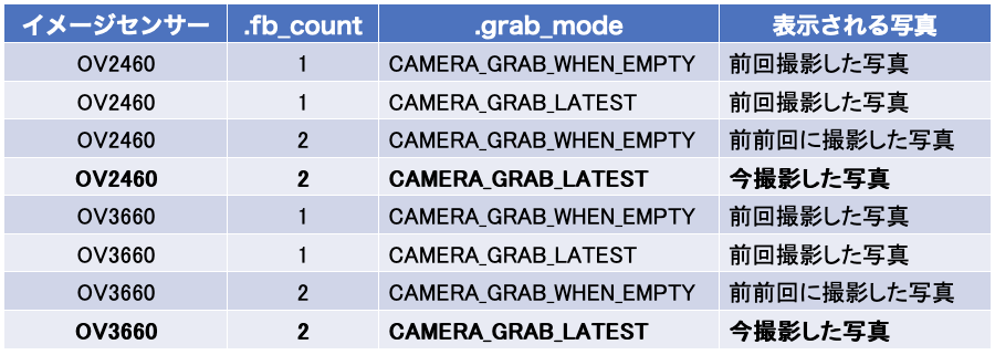 なんと、正しく動作する組み合わせは.fb_countが2で.grab_modeがCAMERA_GRAB_LATESTの1通りしかありませんでした。