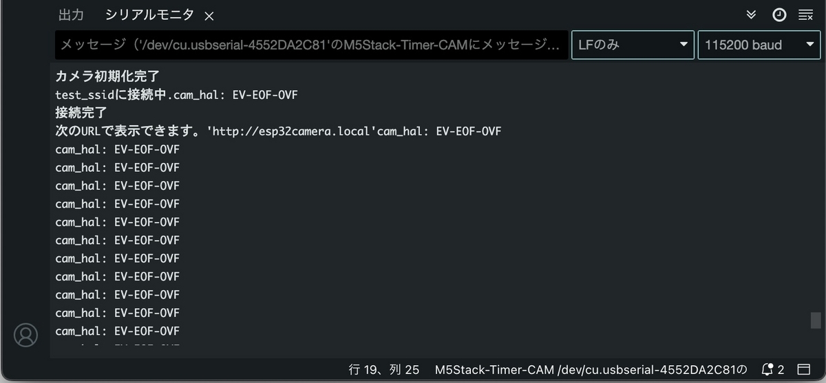 OV3660の画質も向上し一件落着っと思ったのですが、シリアルモニタに見慣れないメッセージcam_hal: EV-EOF-OVFが幾つも出ているのに気づきました。